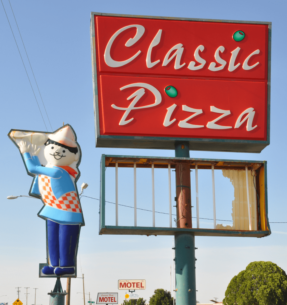 From the Pizza Chef page…. Earlier this year, this former Pizza Inn “Spin Man” (aka Jo Jo) sign in Littlefield, TX….