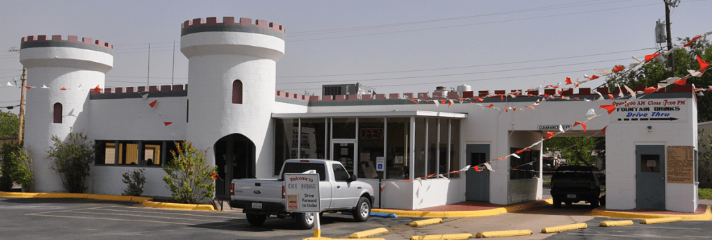 The Hot Dog Castle in Abilene, TX was built in 1975. It has housed many other restaurants since then and been repainted as many times. In 2011, as The Forge, the turrets were more prominent before the addition to the front: