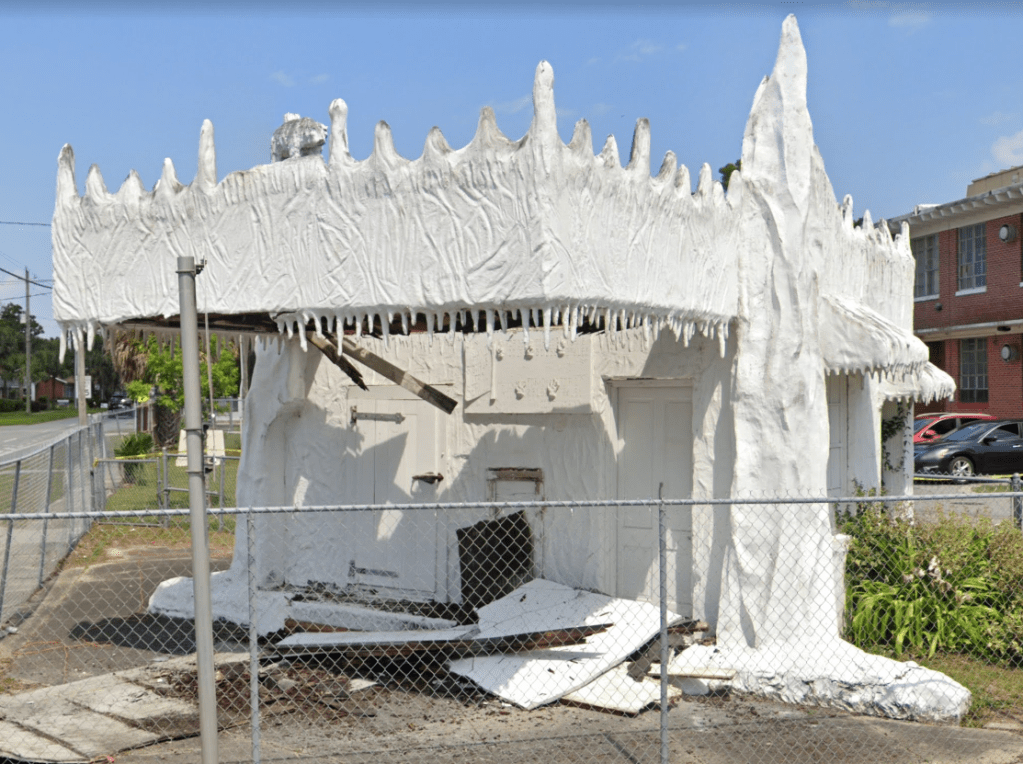 From the Icebergs and Igloos pages. It appears that the canopy roof of the Crystal Ice Company building in Pensacola, FL collapsed earlier this year. The building is listed on the National Register and has been protected behind chain link fencing for years. Here’s hoping that someone will get right on the situation and make the necessary repairs:
