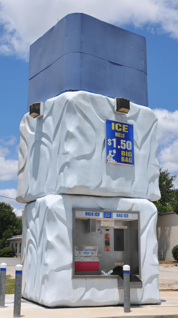 This Iceberg Ice & Water stand in Fredericksburg, TX was recently replaced with a boring box-shaped Twice the Ice stand. Fortunately, there’s another one of these in Rosenberg, TX.