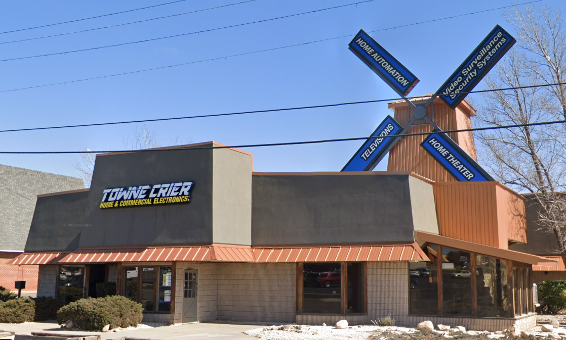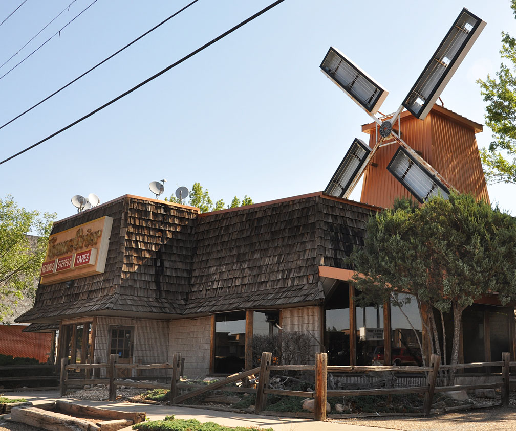 From the Fake Windmills pages… recently, the sign at the Towne Crier in Clovis, NM was replaced and the windmills blades were covered with other new signs. The Towne Crier was built in 1970 as the Zuider Zee seafood restaurant. The Towne Crier moved into the building in 1984. Here are a couple of “before” photos: