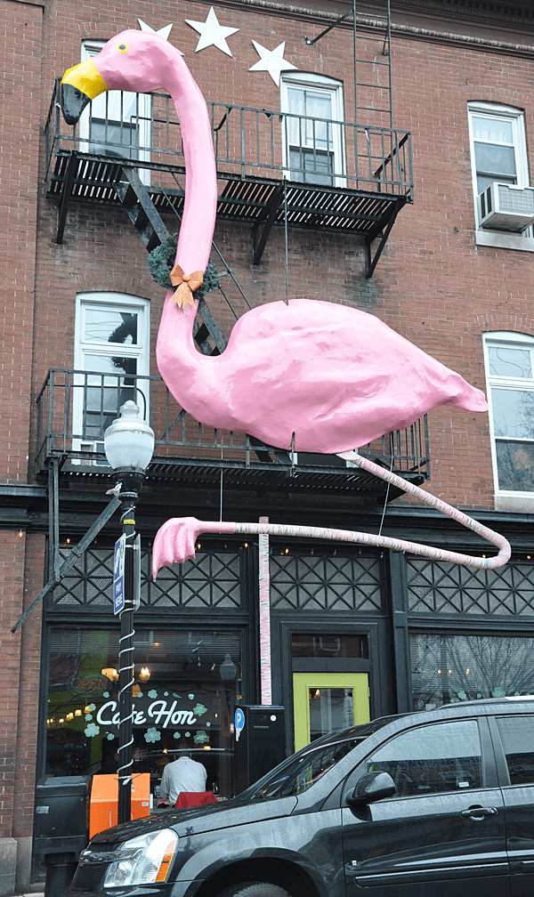 The giant flamingo in Baltimore, MD was installed at the Cafe Hon for 20 years. The restaurant closed in April and the statue is in storage. It is hoped that it will be reinstalled in the same neighborhood at some point.