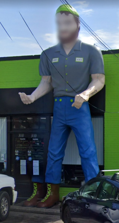 The International Fiberglass Paul Bunyan statue in Roanoke, VA has a new paint job. Google Street View has blurred the face: