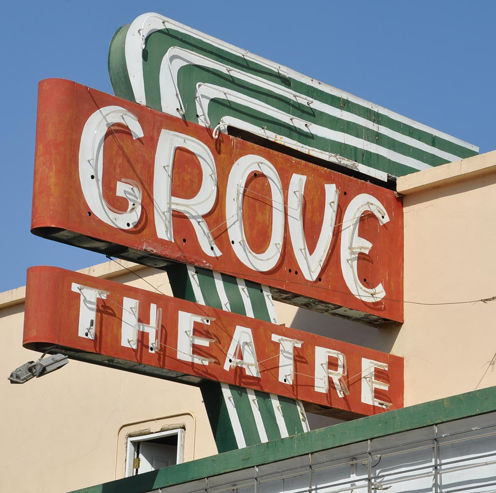 The long-closed Grove Theatre sign in Lindsay, CA: