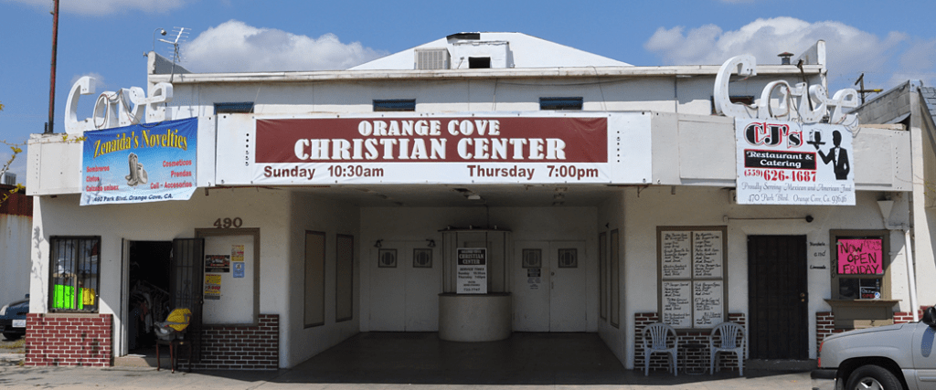 The former Cove Theatre in Orange Cove, CA has housed a church for many years. The Cove letters are gone now: