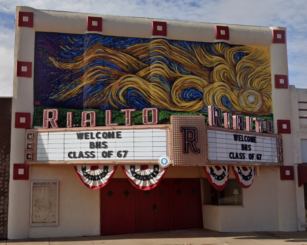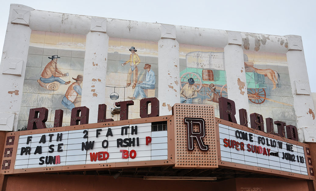 The Rialto Theatre in Brownfield, TX had a faded but nice Western campfire scene above the marquee: