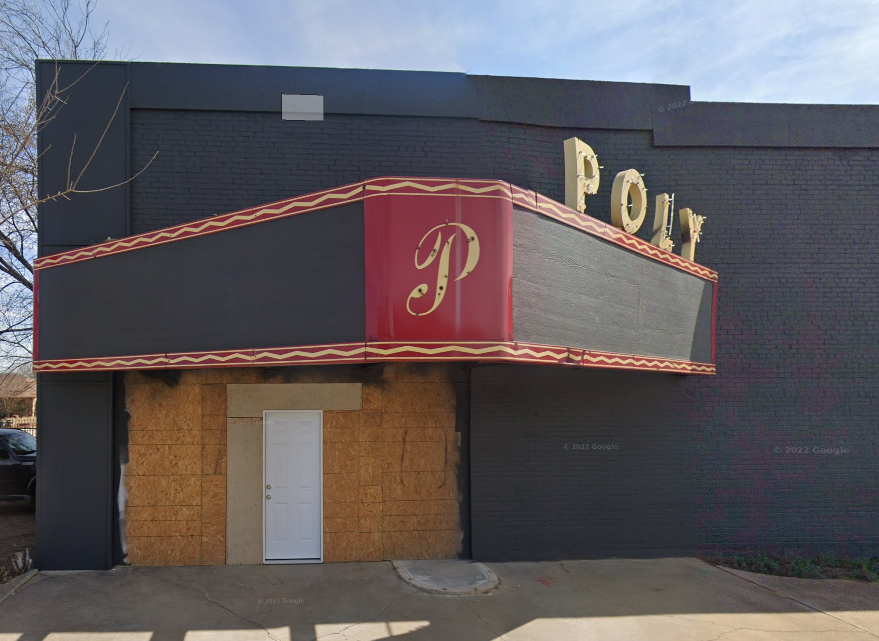 has been refurbished somewhat and is up for sale. It’s been repainted and the sign has been patched up. The ticket booth and the POLY letters on the left are gone:
