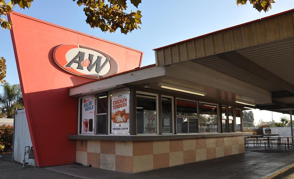 One of the very few remaining original pylon A&W buildings still operating as such closed earlier this year. This building was from the late 1940s in Hanford, CA is vacant and the signs are gone:
