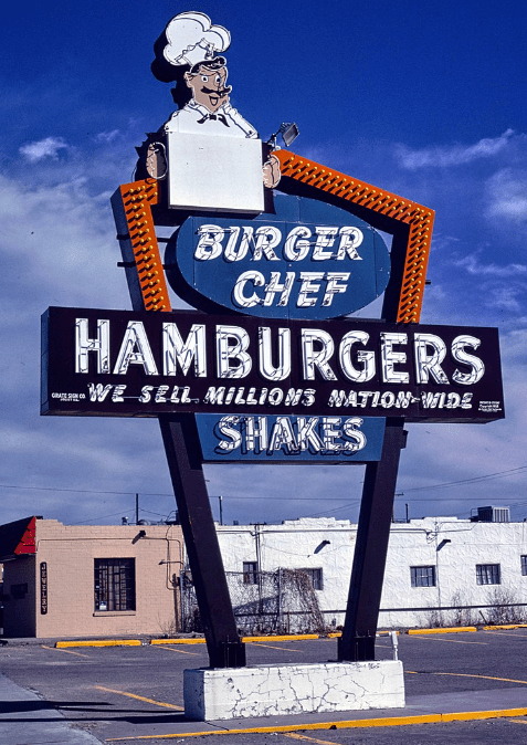 Moving on to Burger Chef signs — as per John Margolies, here’s what the original signs looked like — this one was in Albuquerque, NM:
