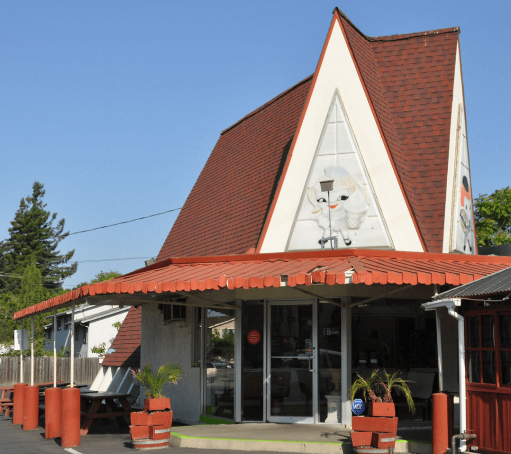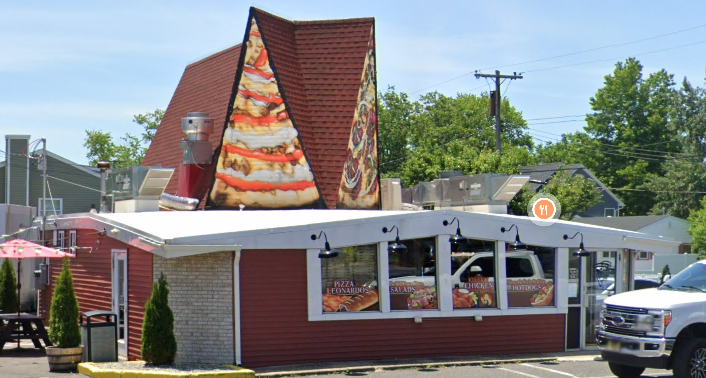 The former Dari-Delite in Point Pleasant, NJ now houses Oakwood’s Point Pizza. The building’s gables have been painted to look like pizza slices: