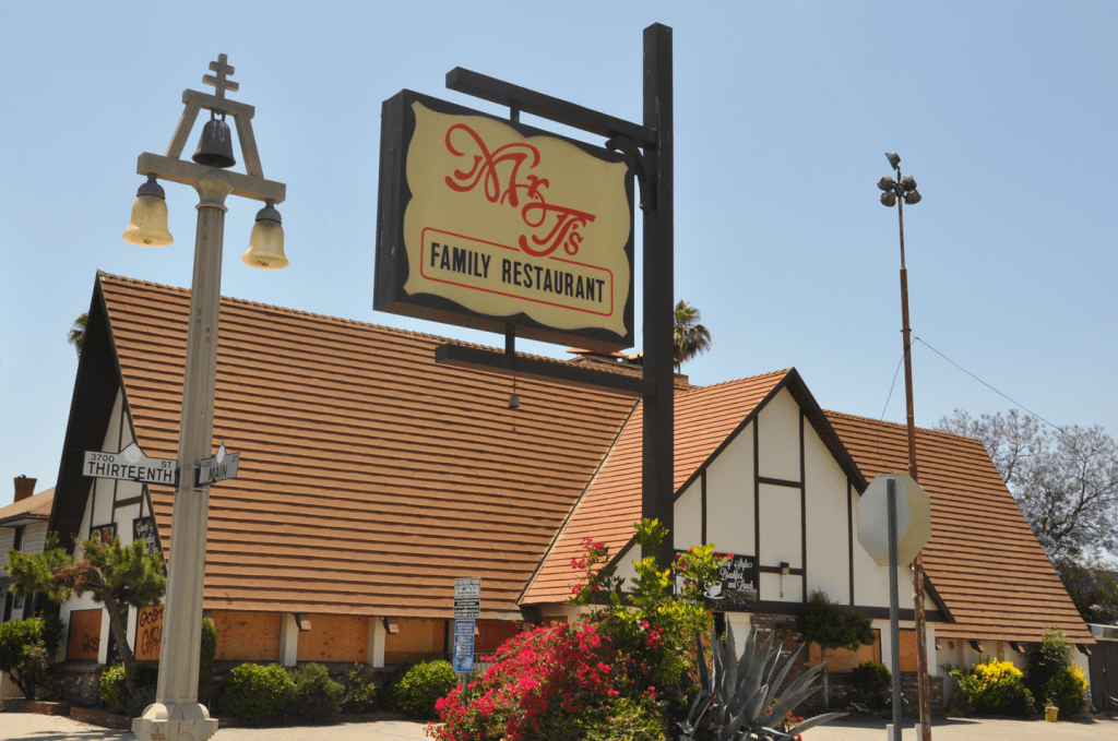 This former International House of Pancakes in Riverside, CA had housed Mr. T’s since 2011. It closed in 2019. The building was badly damaged by a fire earlier this year and demolished: