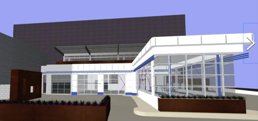 The building is now being renovated. It looks like they are walling up the canopy area with glass windows and adding another bay-like area to the left: