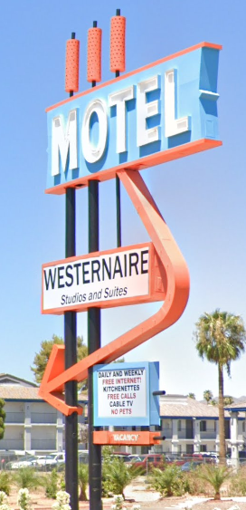 The Westernaire Motel sign in Mesa, AZ has been repainted. The cylinders and arrow were yellow previously: