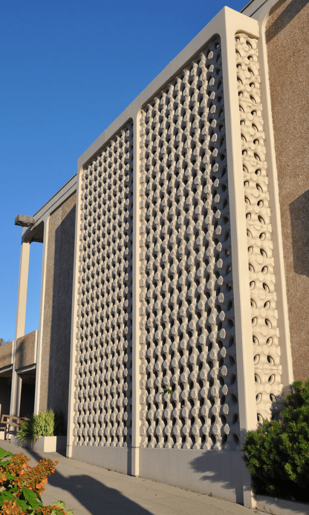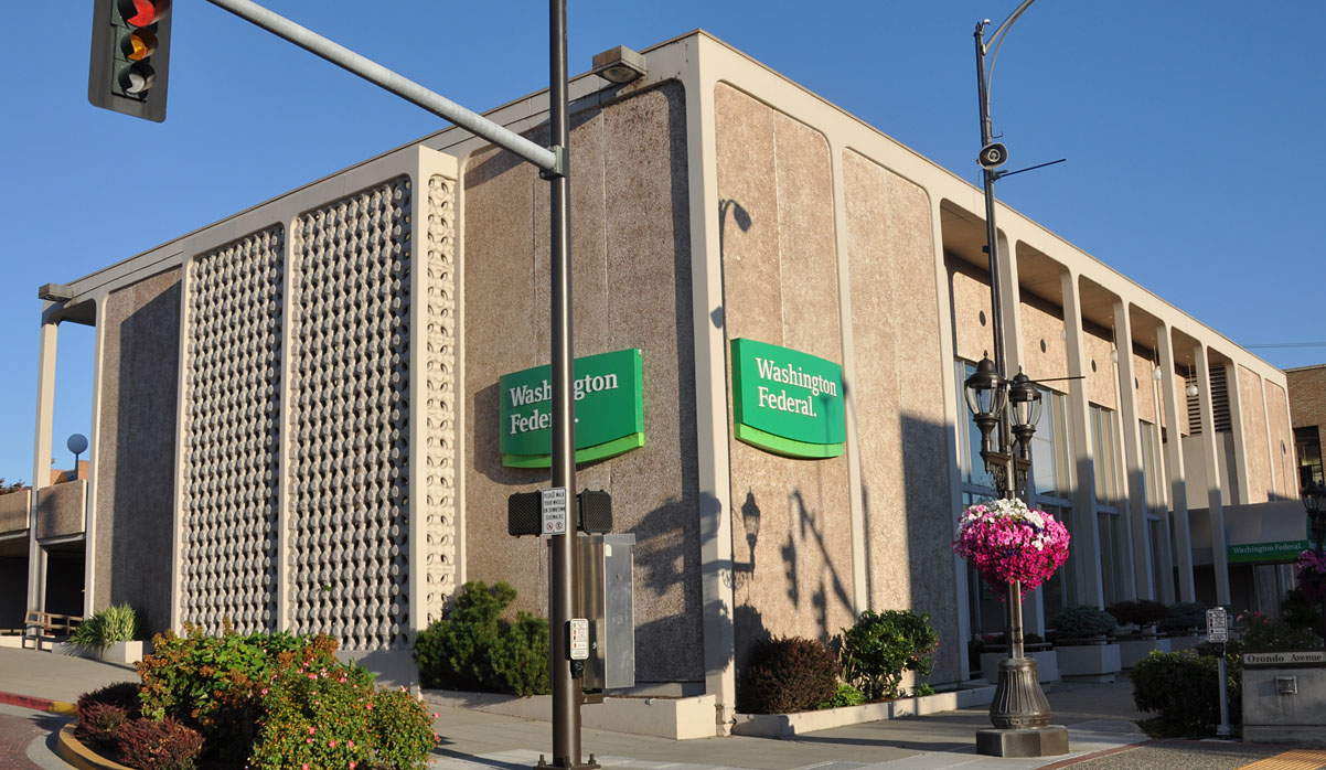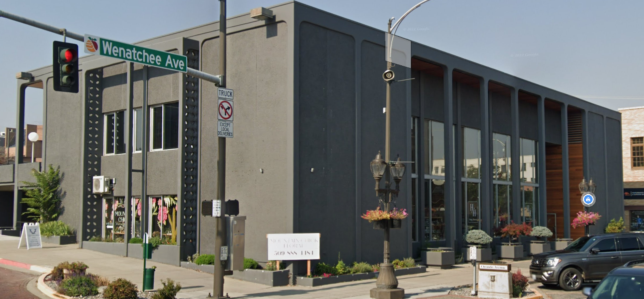 This lovely bank building with cast concrete screens in Wenatchee, WA was vacant in 2018. Last year, it began housing retail space — guess what color they painted it?