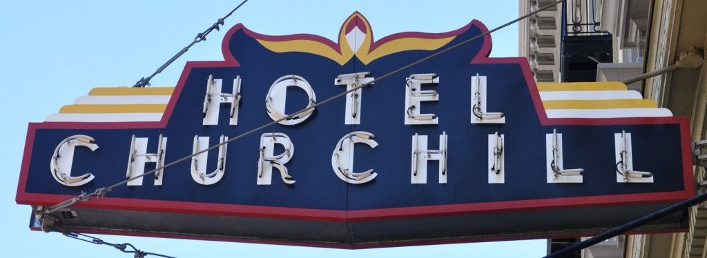 The Hotel Churchill in San Diego was built in 1914. There is a giant rooftop sign (I posted a photo at Flickr) from the 1940s which was removed and restored during a building restoration in 2015. That sign went back up in 2016. This sign was created at the same time based on historic photos: