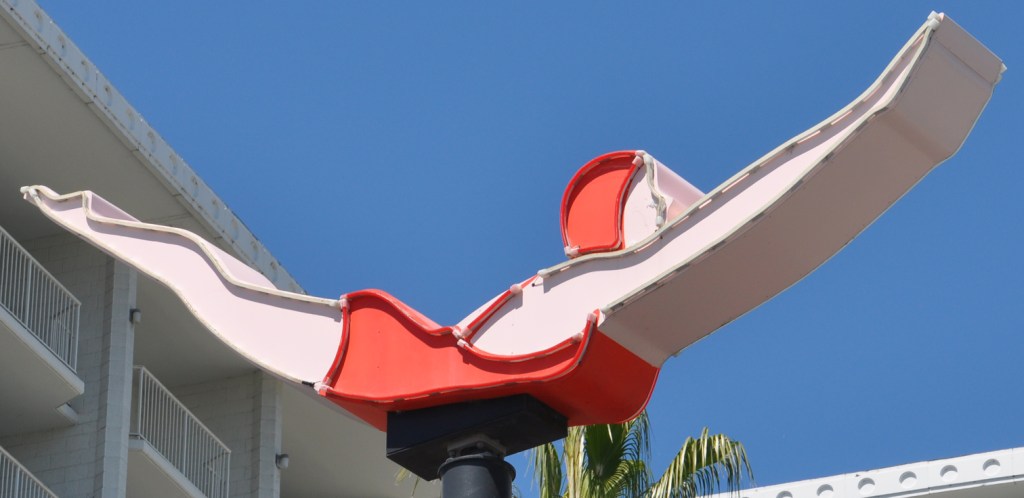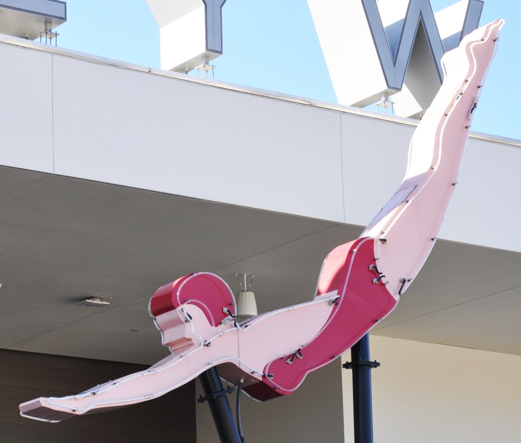 Also at the Town & Country Resort, this 15-foot-long diver sign was built and installed in 2020 at the Lapper poolside bar. She is named “Thelma.” Although she’s referred to in articles and by the resort itself as “neon,” obviously that’s cheesy LED strips. But she does look pretty at night anyway: