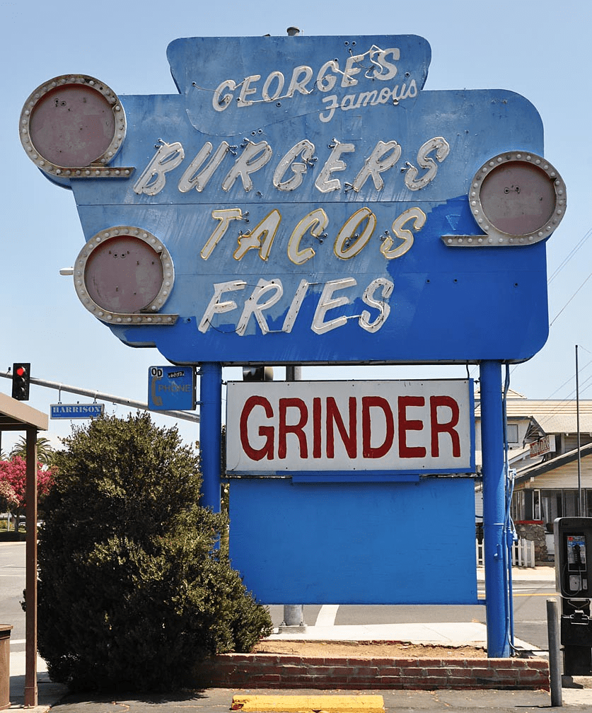 I wish I knew what the sign looked like originally. I did find somewhere that the drive-in opened in 1955 and the sign went up in 1957. However, George’s Instagram and other articles say they opened in 1974. Surely, this sign is from the 1950s. So, maybe this wasn’t the drive-in’s original name. There was an identical sign in San Bernardino, CA which has been further remodeled and doesn’t look like the StreetView image below anymore. I did find an old advertisement online from 1957 with the right address and listed the place as Ted’s Shortstop Drive-in. So, perhaps George’s was a Ted’s Shortstop originally – but I find no evidence of that.