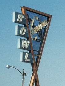 This sign at George’s Drive-in in Riverside, CA was recently “restored.” But I have to say that I’m disappointed even though any attempt to preserve signs is a good thing. It was repainted entirely red. It looks like those are new clear bulbs in the circles but I’m skeptical that they chase like they must have originally. The neon was restored but they did a sloppy job with the connecting wires putting them on top of the panels instead of moving those inside the panels: