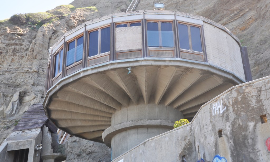 It was a big walk to get to this (and no dogs allowed on the beach ☹) but I finally toughed it out. This is the Bell Beach Pavilion (aka Mushroom House) in La Jolla, CA from 1968. It’s right on the beach. The homeowners have access via a 300-foot tram elevator down the cliff behind the house: