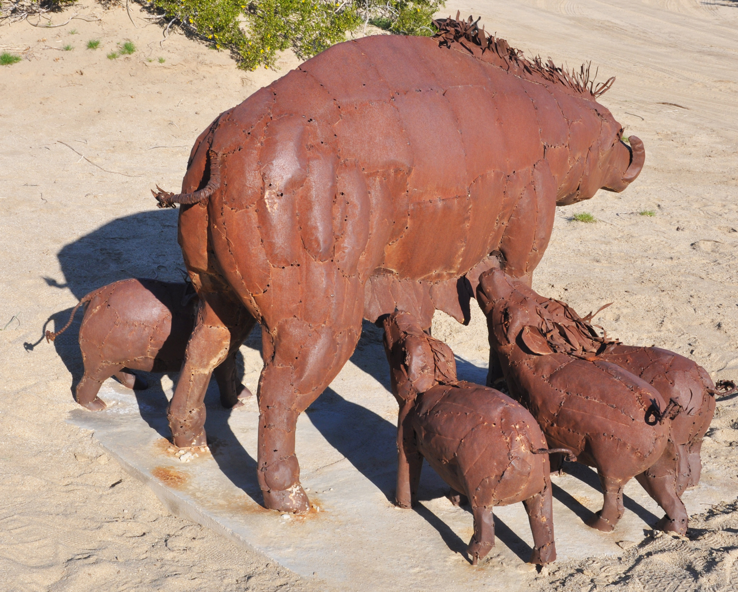 This place was a GREAT stop for me AND the dogs. Orbit got some cholla stickers in a foot but I was able to hold him down and get them out quickly. There are dozens of these sculptures in Borrego Springs, CA in the middle of the desert. And you can drive your vehicle around on the sand and let your doggies run free safely. Here’s some info about the place: