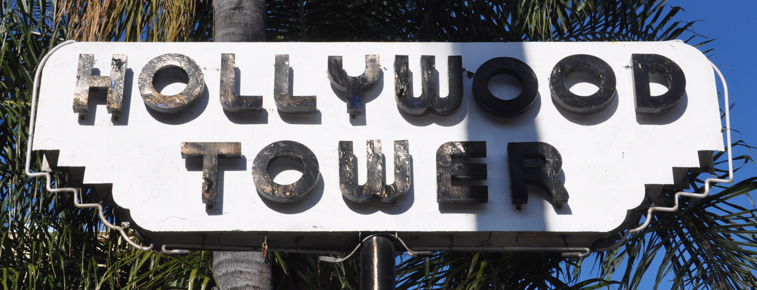 The Hollywood Tower Apartments (in Hollywood, CA) was built as La Belle Tour in 1929. The name was changed in 1942. This sign looks 1920s or 1930s to me. So, it was most likely built then and the raised letters were changed. Either that, or this pole sign was built in 1942 in the style of the original sign: