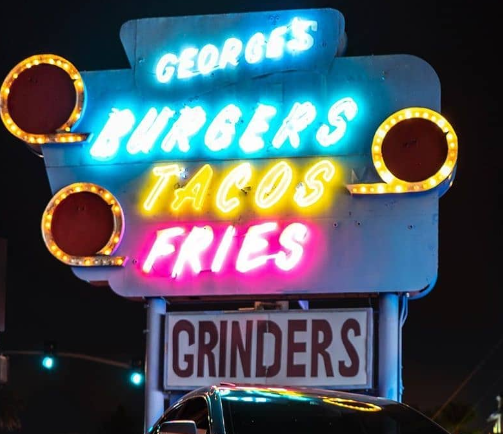 I wish I knew what the sign looked like originally. I did find somewhere that the drive-in opened in 1955 and the sign went up in 1957. However, George’s Instagram and other articles say they opened in 1974. Surely, this sign is from the 1950s. So, maybe this wasn’t the drive-in’s original name. There was an identical sign in San Bernardino, CA which has been further remodeled and doesn’t look like the StreetView image below anymore. I did find an old advertisement online from 1957 with the right address and listed the place as Ted’s Shortstop Drive-in. So, perhaps George’s was a Ted’s Shortstop originally – but I find no evidence of that.
