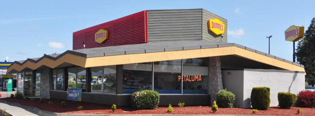 This “crown roof” (my term) Denny’s from 1969 in Petaluma, CA was closed for a few years recently for “remodeling.” Fortunately, it was a gentle rehab with the zigzag panels on the roof replaced with these flat ones. But hey: they left the roofline and the stone: