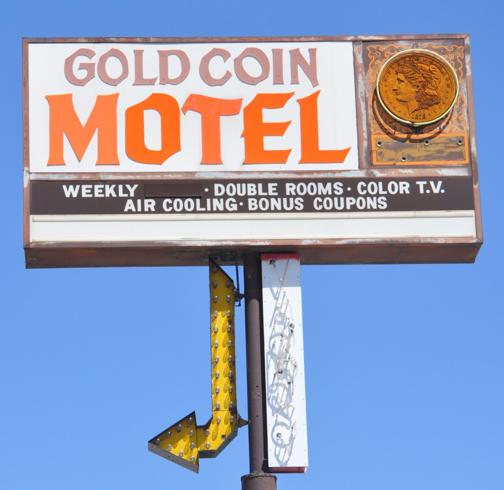 This sign in Reno, NV has gotta be 1960s. No matter than the coin depicted is a silver dollar (not actually a gold coin):