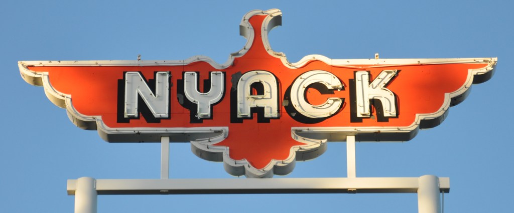 This former Nyack Lodge sign is behind the Shell station in Emigrant Gap, CA. It was the end of the day so the lighting wasn’t great, but hey. The sign originally read “Nyack Lodge, Herstle Jones,” putting the owner’s name in lights, literally. And there was a separate panel reading “Fine Food”: