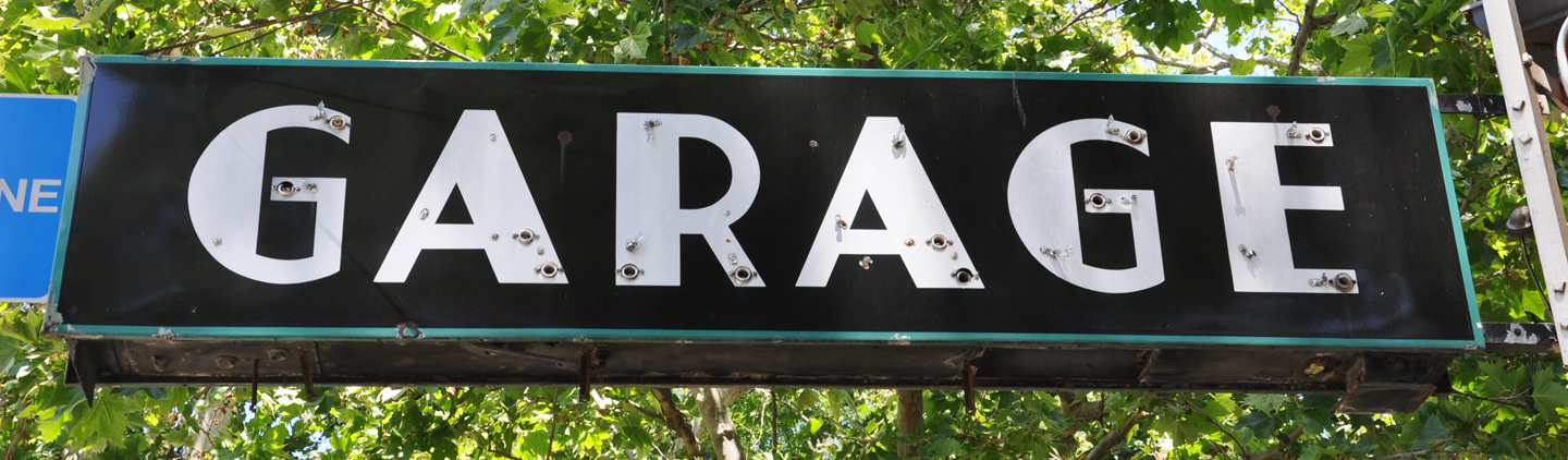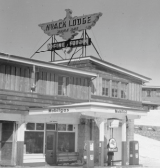 This former Nyack Lodge sign is behind the Shell station in Emigrant Gap, CA. It was the end of the day so the lighting wasn’t great, but hey. The sign originally read “Nyack Lodge, Herstle Jones,” putting the owner’s name in lights, literally. And there was a separate panel reading “Fine Food”: