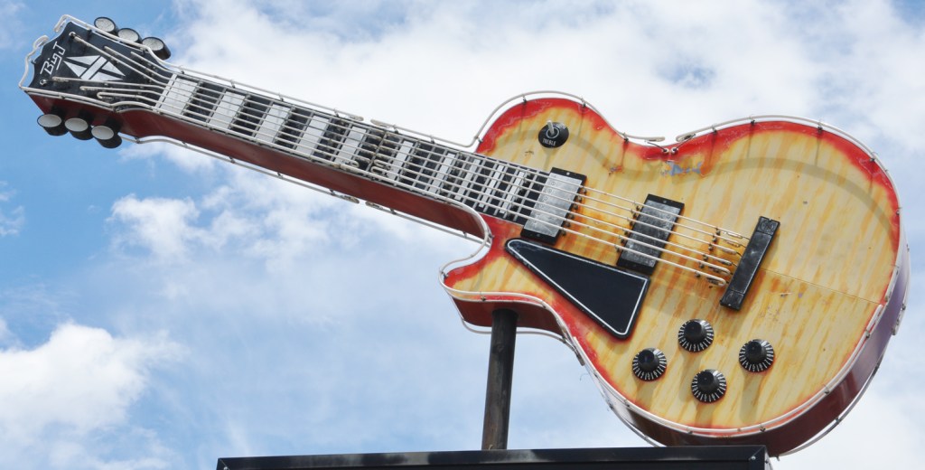 This giant guitar is installed above the sign at Big J Jewelry & Loan: