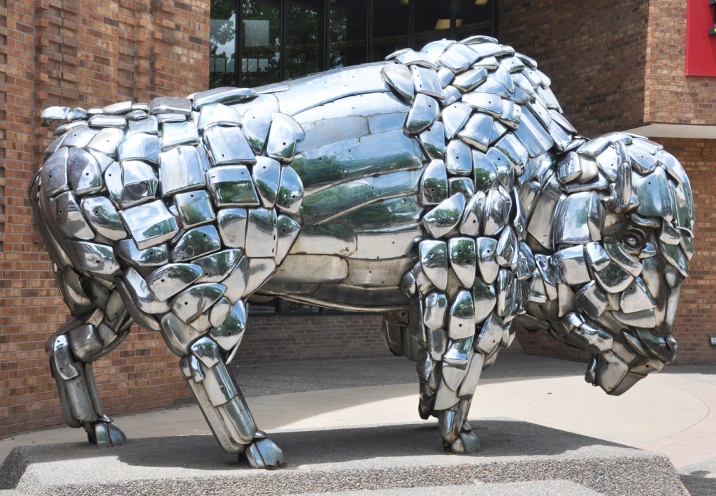 How about three giant things in Grand Junction – this chrome car bumper buffalo in front of the Wells Fargo Bank: