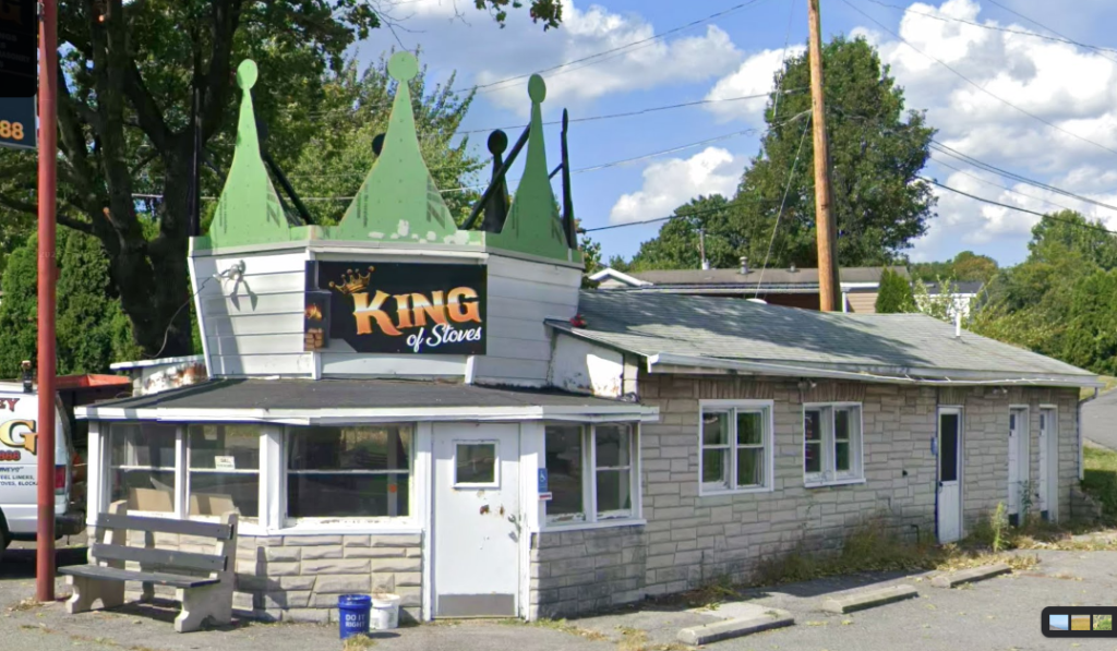 From the Vessels section (giant bottles, coffee pots, and other giant containers)… This building in Reading, PA was built for the Levengood Dairies milk/ice cream store chain with cup-shaped buildings. Over the years, the rounded cup was covered with siding and the giant straw was removed. The building housed Speedie’s Dinette from 1974-2020. It had been vacant since then. My photo from 2010: