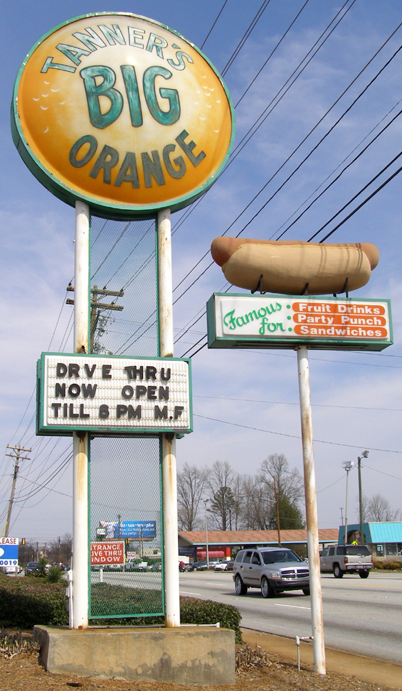 Tanner’s Big Orange opened at this location in Greenville, SC in 1966 and this sign with the giant hot dog was installed then. The restaurant closed in 2023 and there’s a new pizza place going into the building. It sounds like this sign is coming down and will most likely be destroyed: