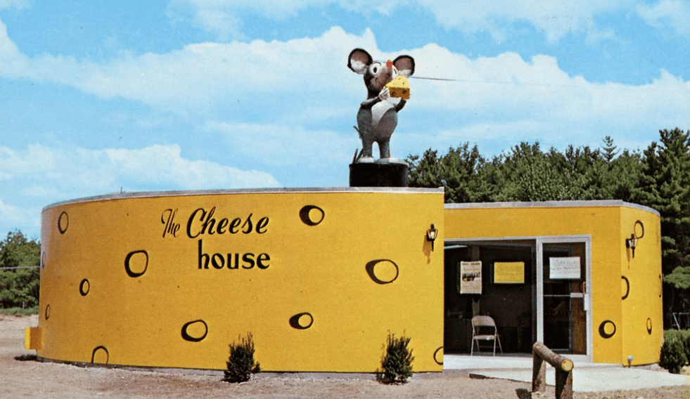 The former Cheese House in Wells, ME, with its wheel of cheese shaped building, has closed. There were about 20 of these buildings in this 1960s chain and only a handful of these buildings are left. The scruffy mouse on the roof is also gone. I’m devastated. He was the last mouse left: