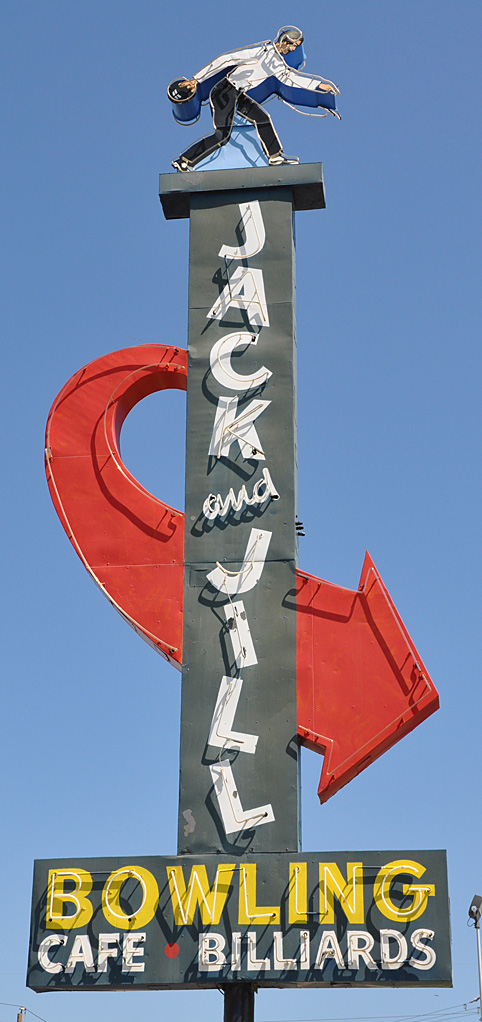 About a week ago, the Jack and Jill Bowling Lanes sign in American Fork, UT fell over during high winds. My photo from 2014: