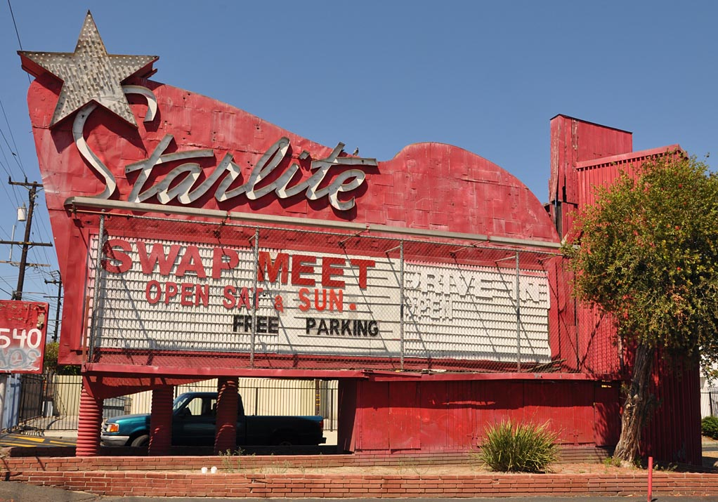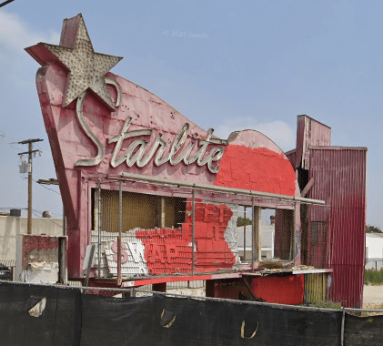 Moving on to Drive-in Theatres section. The Starlite Drive-in in El Monte, CA has been bulldozed for housing. But, as promised, they are “preserving” the sign. It must be a replica since the current sign was a complete wreck. Here’s a photo I took in 2013: