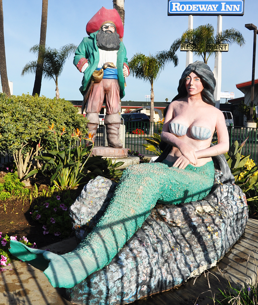 The Pirate and the Mermaid in Oceanside, CA are gone now. I believe they were installed in 1969 next to the Flying Bridge Restaurant. In 2025, the mermaid was destroyed. The pirate was rescued, restored, and sold. He may be installed later at Oceanside High School: