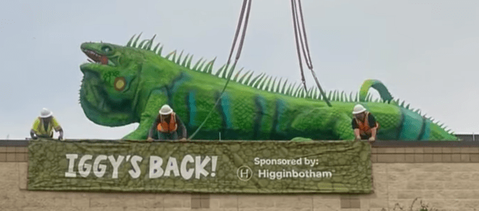 Some good news for the Other Reptiles page — Iggy the Iguana was returned to top of the building last year at the Fort Worth Zoo in Fort Worth, TX after restoration: