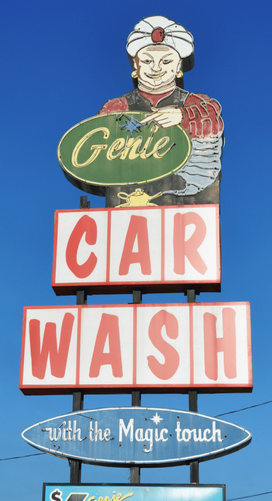 This Genie Car Wash in Waco, TX was built in 1964 as the chain’s first location. It was the very last of the vintage signs on display — gone now but I’m hoping someone saved it: