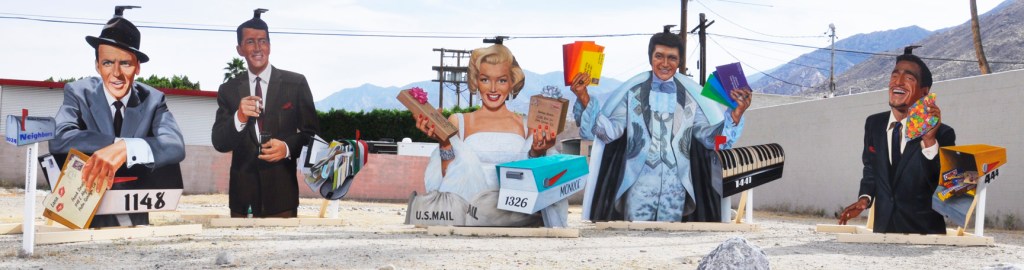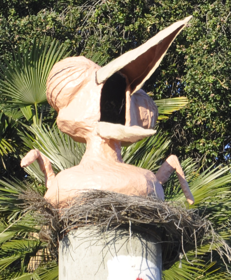 This bird statue is known as “Pinky” and is installed way up on a pillar at a construction site in Eagle Rock: