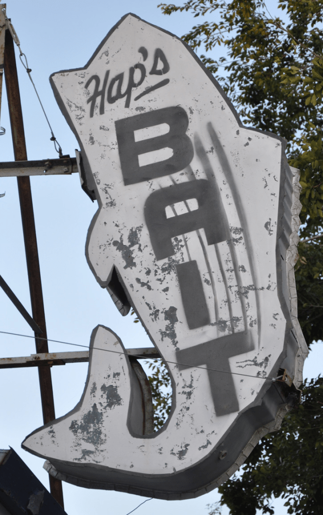 Last year Hap’s Bait in Rio Vista, CA moved from downtown to the Brannan Island State Recreation Area park. I don’t know if this sign made the move or if it’s gone now:
