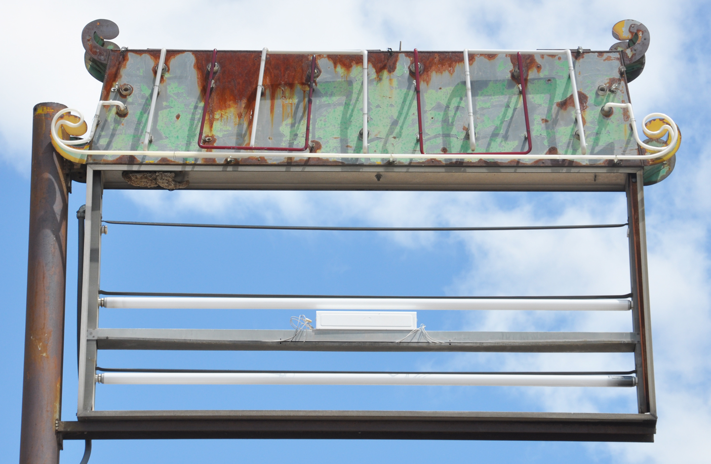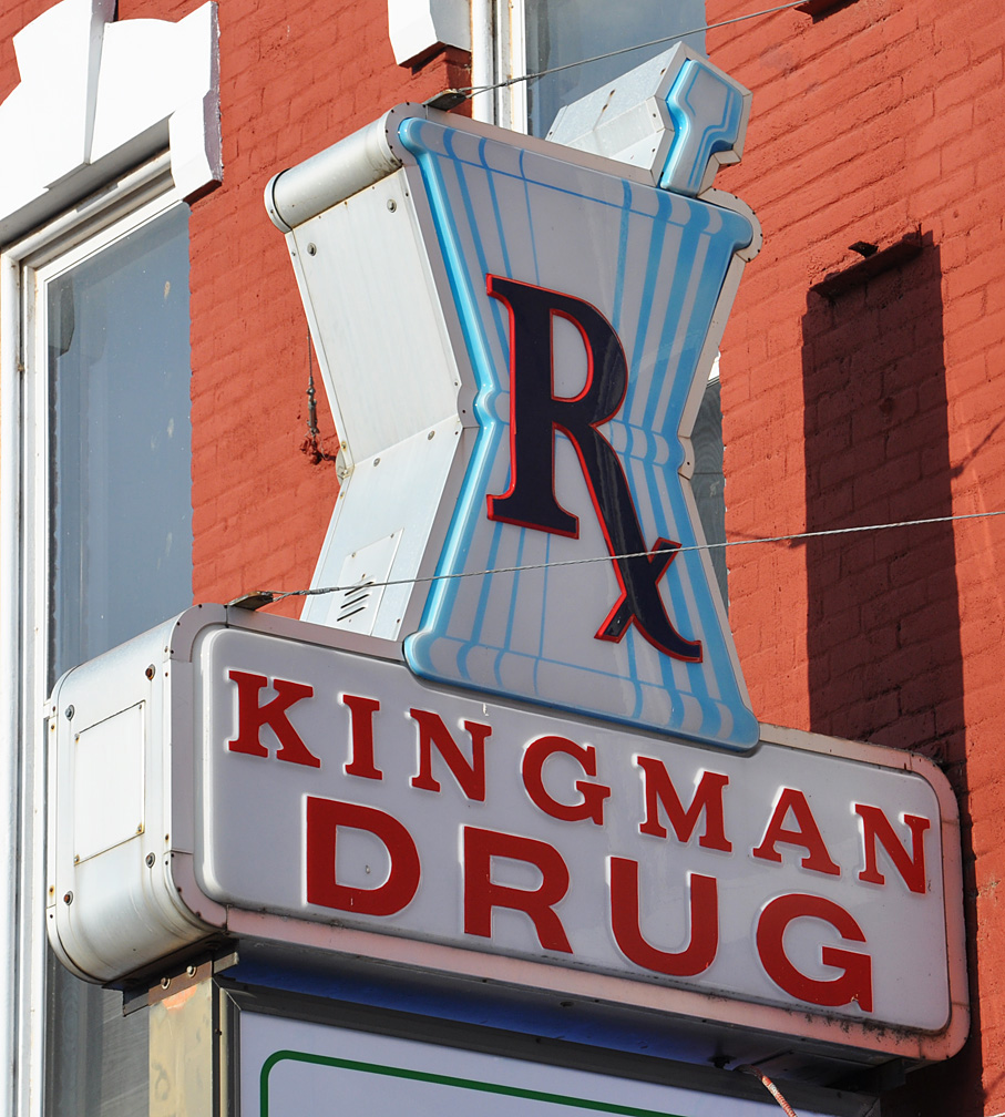 This Crown Drugs projecting sign in Kansas City, KS is now in storage at the Midwest Sign Company in Kansas City, KS. Now that the sign is down, you can see where the “D” and “S” would have been. I suspect that the fascia letters had the “D” and “s” originally and were just moved closer together when the rug business moved in. My photo from 2010: