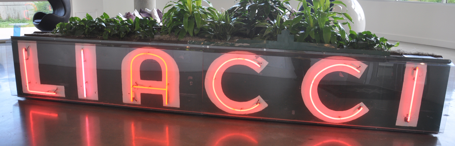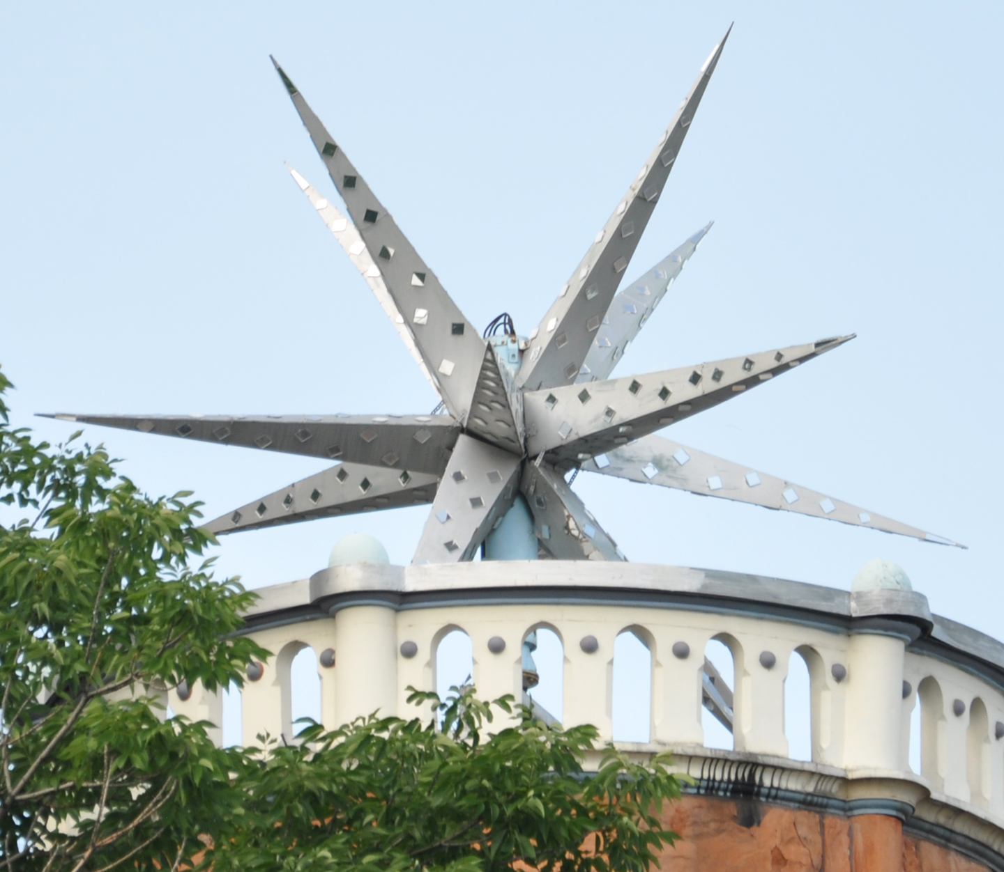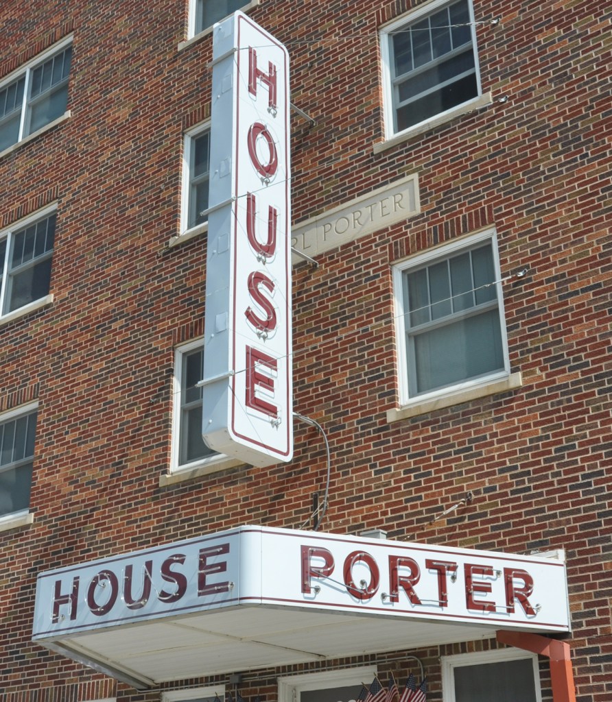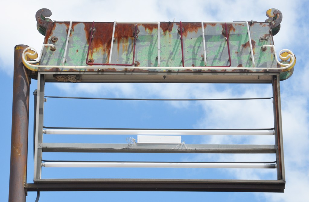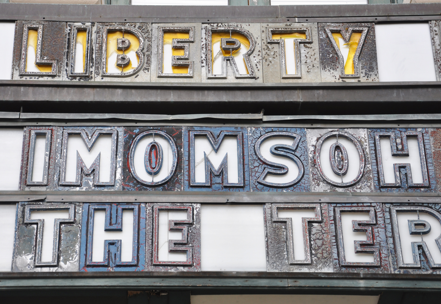 These crude, changeable letters at the Liberty Hall in Lawrence are intriguing. I can’t tell if they are metal or ceramic. Obviously, they have/had backlit glass. The bottom letters appear to have plastic inside. I can confirm from recent photos that the letters are all still lit at night: