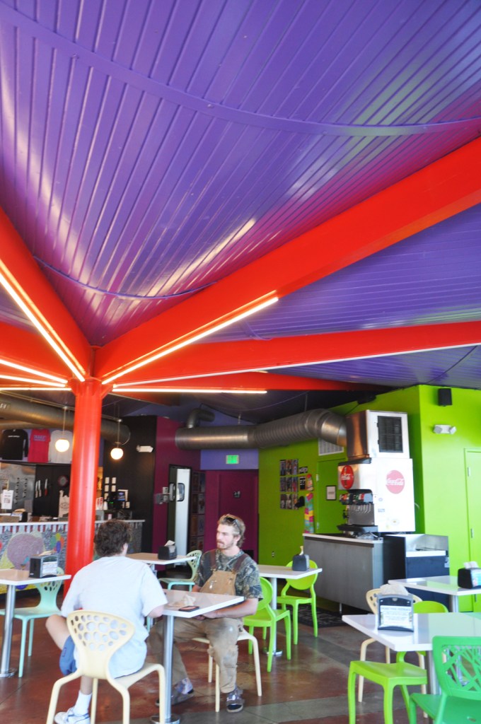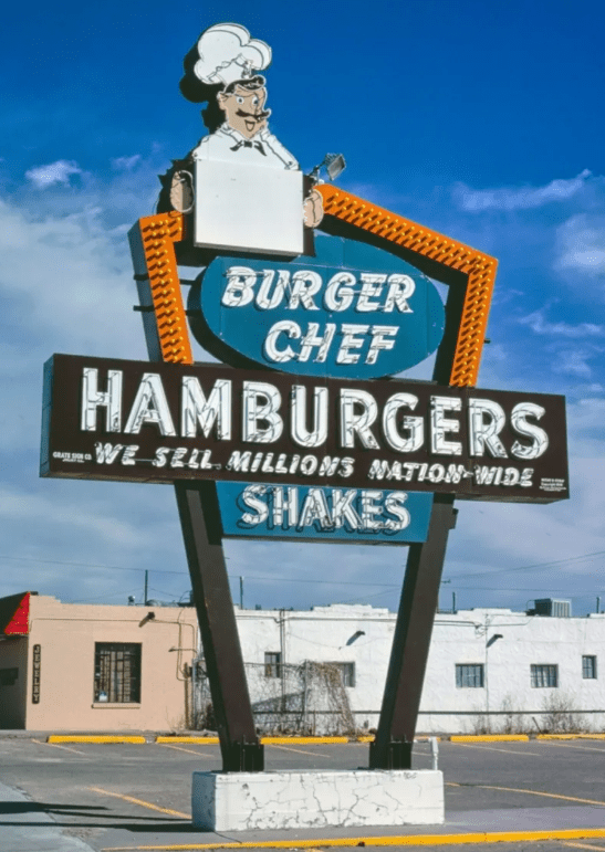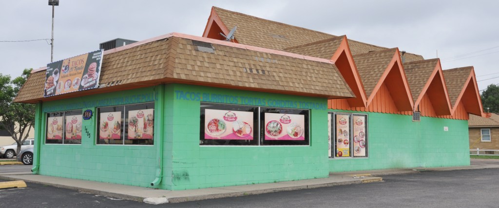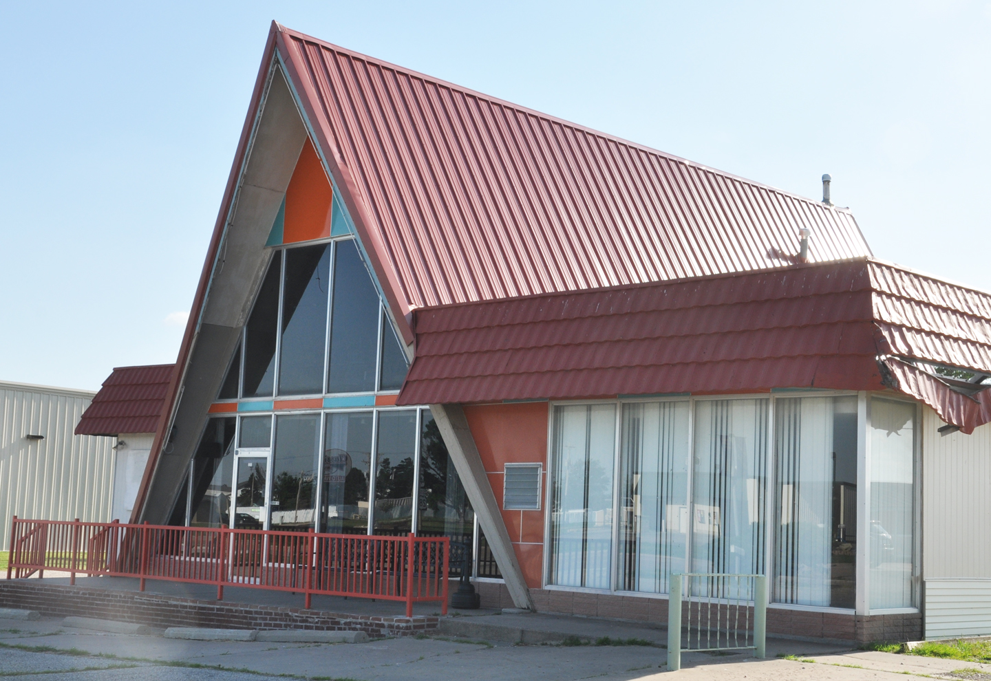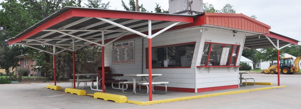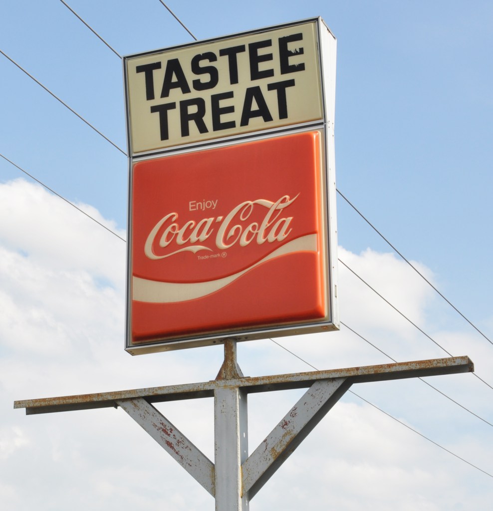 This sign is at the former Tastee-Freez in Olathe, KS. It’s still there despite several other name changes and even though the building with the sawtooth roof is vacant now: