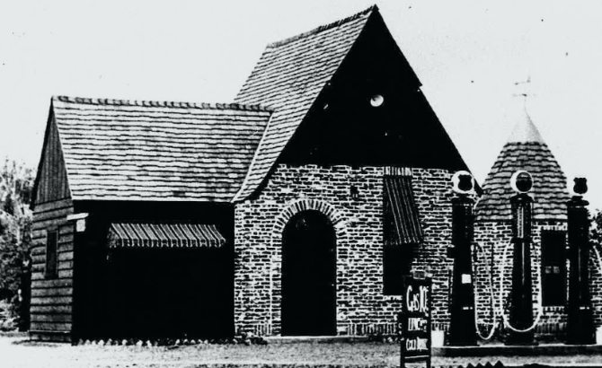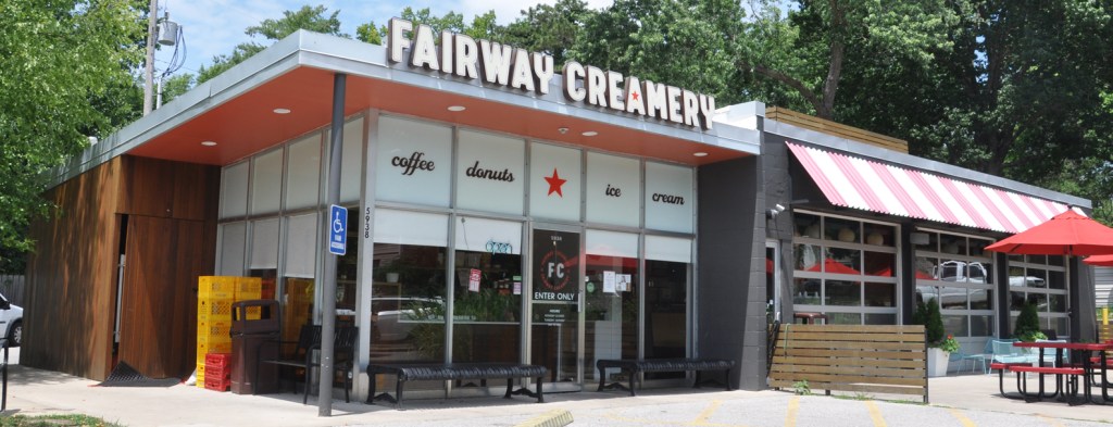 This former gas station in Fairway, KS was built around 1961, possibly as a Sinclair. The building housed a pizza place recently but is now an ice cream/coffee shop: