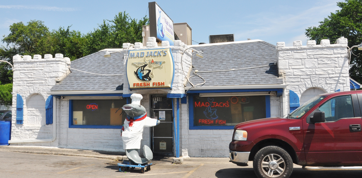 Mad Jack’s Fresh Fish in Kansas City, KS is a two-fer with a castle-style building and a fiberglass catfish chef: