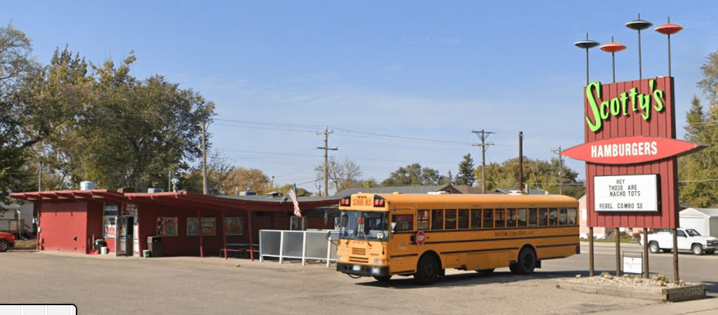 Scotty’s Drive-in in Aberdeen, SD opened in 1962 as part of a small chain with locations in North Dakota, South Dakota, Nebraska, and Idaho which all had these signs and swoopy roofs with curved wood beams: