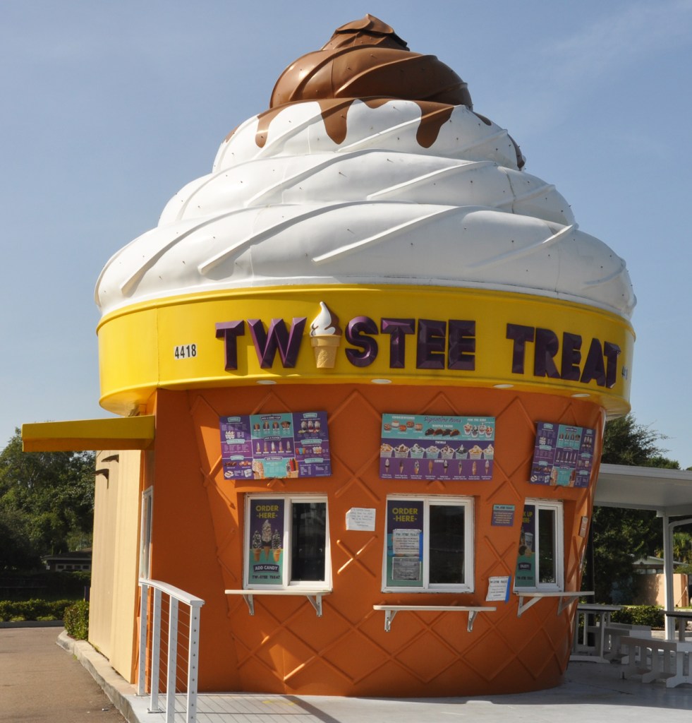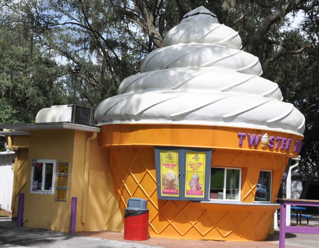 One of the very rare Dairy Queens A-frame buildings which, I believe, were only built in Florida. This one in Port Charlotte is a little squattier than the others: