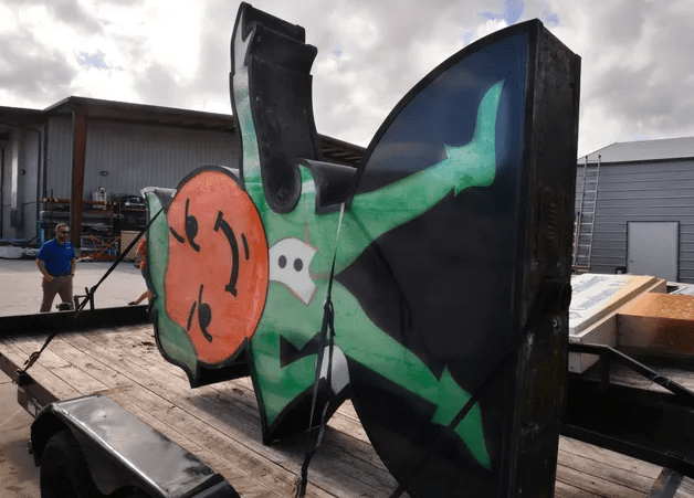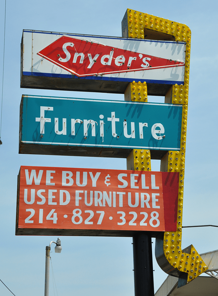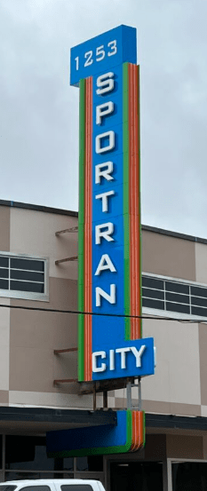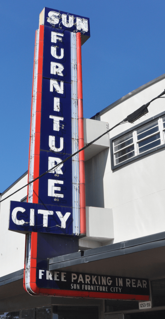 Sun Furniture in Shreveport, LA closed in 2018. In 2022, the sign was removed to be adapted for SporTran City. Note the neon tubing of a sun on top of the “SUN” letters: